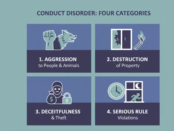 The DSM-5 (Diagnostic and Statistical Manual of Mental Disorders) provides specific criteria for Conduct Disorder. These behaviors are generally grouped into four main categories: